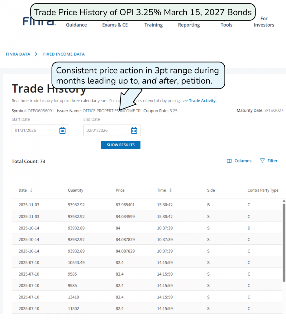 Here’s a link to view this information directly in the TRACE system: OPI 3.25% Mar 15 2027 TRACE
